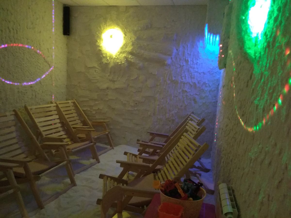 Дополняет положительный эффект от сеанса солевое покрытие стен и пола, которое служит в качестве поглотителя лишней влаги в помещении, а также является природным антисептиком, обеспечивая гипоаллергенность и антибактериальность микроклимата в соляной комнате.